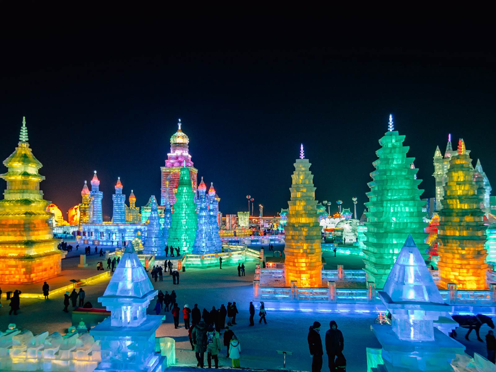 Nếu bạn muốn trải nghiệm mùa đông thần tiên, hãy ghé Harbin (Trung Quốc) vào dịp lễ hội băng tuyết. Những lâu đài, công trình điêu khắc bằng băng khổng lồ được thắp sáng lung linh, tạo nên khung cảnh như bước ra từ truyện cổ tích.